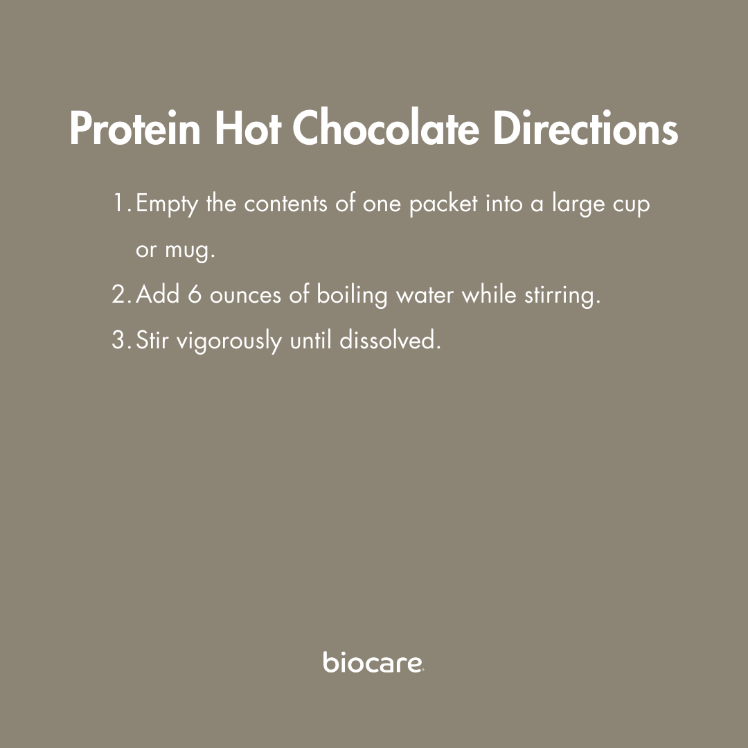 A rich hot cocoa that feels like a winter treat, but fits right into a higher-protein, goal-focused routines. Each single-serve packet turns a mug of hot water into a smooth, cozy drink you can actually feel good about sipping. Perfect for Biocare fans who want something warm and indulgent.